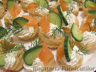 De mai multa vreme, tot ocoleam un aluat de foietaj prin congelator, asteptand un moment in care sa-l pregatesc. Si cum zilele trecute au venit niste prieteni pe la noi, m-am gandit ca ar fi foarte bune niste aperitive cu crema de branza, somon, toate asezate pe niste "banuti" din aluatul de foietaj. Daca vreti sa mearga mai repede, puteti folosi in locul aluatului biscuiti sarati sau felii de mini-toast.